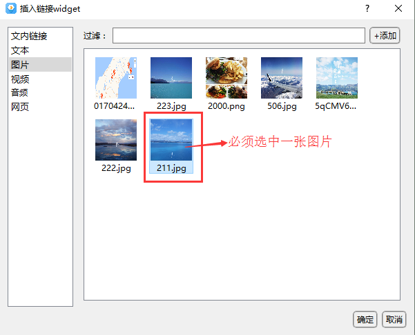 答:通常在鏈接控件的編輯界面,需要在資源庫中選中一個資源文件后,點擊添加才可以。用添加圖片鏈接舉例說明:如下圖,在鏈接widget界面插入圖片時,必須選擇圖片,否則會操作失敗。